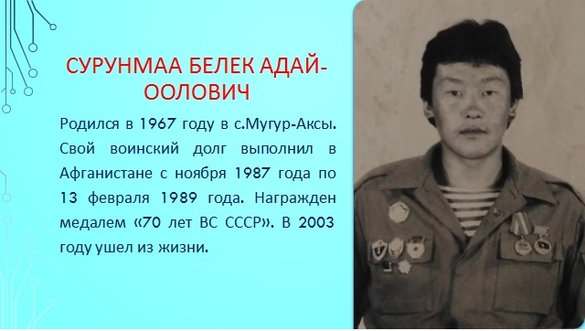 5. Сурунмаа Белек Адай – оолович родился в 1967 году в с.Мугур – Аксы. Свой воинский долг выполнил в Афганистане с ноября 1987 года по 13 февраля 1989 г. Награждён медалем «70 лет ВС СССР». В 2003 году ушёл из жизни.