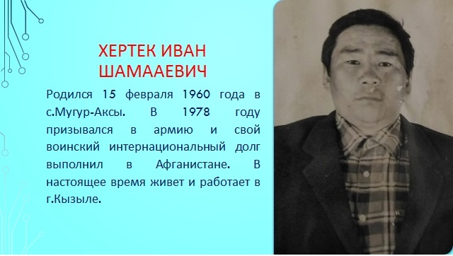 9. Хертек Иван Шамааевич родился 15 февраля 1960 года в с. Мугур – Аксы. В 1978 году призывался в армию и свой интернациональный долг выполнил в Афганистане. В настоящее время живёт и работает в г.Кызыле.