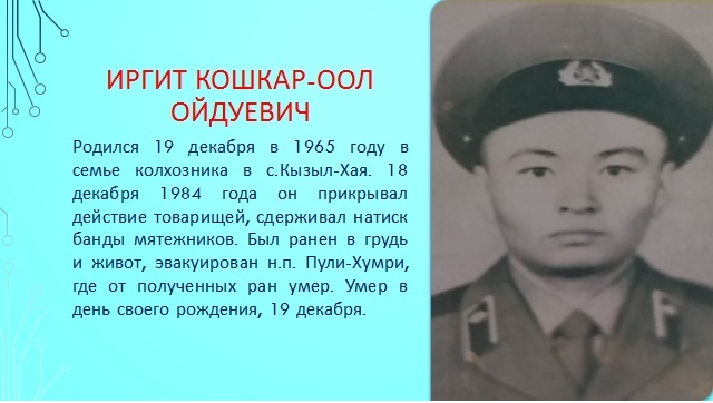 1. Иргит Кошкар – оол Ойдуевич родился 19.12. 1965 году в семье колхозника в с. Кызыл – Хая. Осенью, 1984 призывался в армию и направлен в Афганистан. Принимал участие в 12 – ти боевых выездах на трассу трубопроводов для устранения последствий диверсий, в двух нападениях мятежников. 18 декабря 1984 Иргит Кошкар – оол прикрывал действие товарищей из автомата в течение 20 минут, сдерживал натиск банды мятежников. Был ранен в грудь и живот, эвакуирован н.п. Пули – Хумри, где от полученных ран умер. Умер в день своего рождения, 19 декабря.