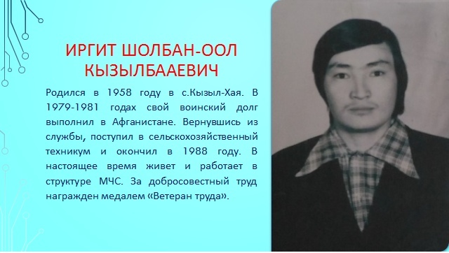 8. Иргит Шолбан – оол Кызылбааевич родился в 1958 году в с. Кызыл – Хая. В 1979 – 1981гг свой воинский долг выполнил в Афганистане. Вернувшись из службы, поступил в сельскохозяйственный техникум и окончил в 1988 году. В настоящее время живёт и работает в структуре МЧС. За добросовестный труд награждён медалем «Ветеран труда».