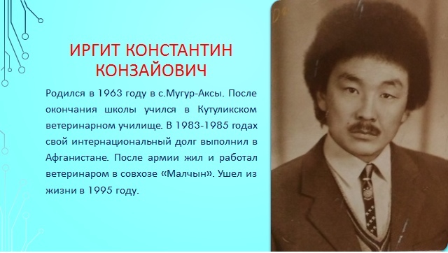 2. Иргит Константин Конзайович родился в 1963 году в с. Мугур – Аксы. После окончания школы учился в Кутуликском ветеринарном училище.