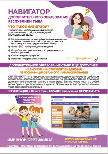 Все муниципальные, а в будущем и частные организации, реализующие программы дополнительного образования, которые хотят функционировать в системе персонифицированного дополнительного образования, будут входить в реестр поставщиков образовательных услуг и вносить свои образовательные программы в специальный навигатор информационной системы. В настоящее время работа по регистрации поставщиков образовательных услуг в информационной системе https://tyva.pfdo.ru/ уже ведется